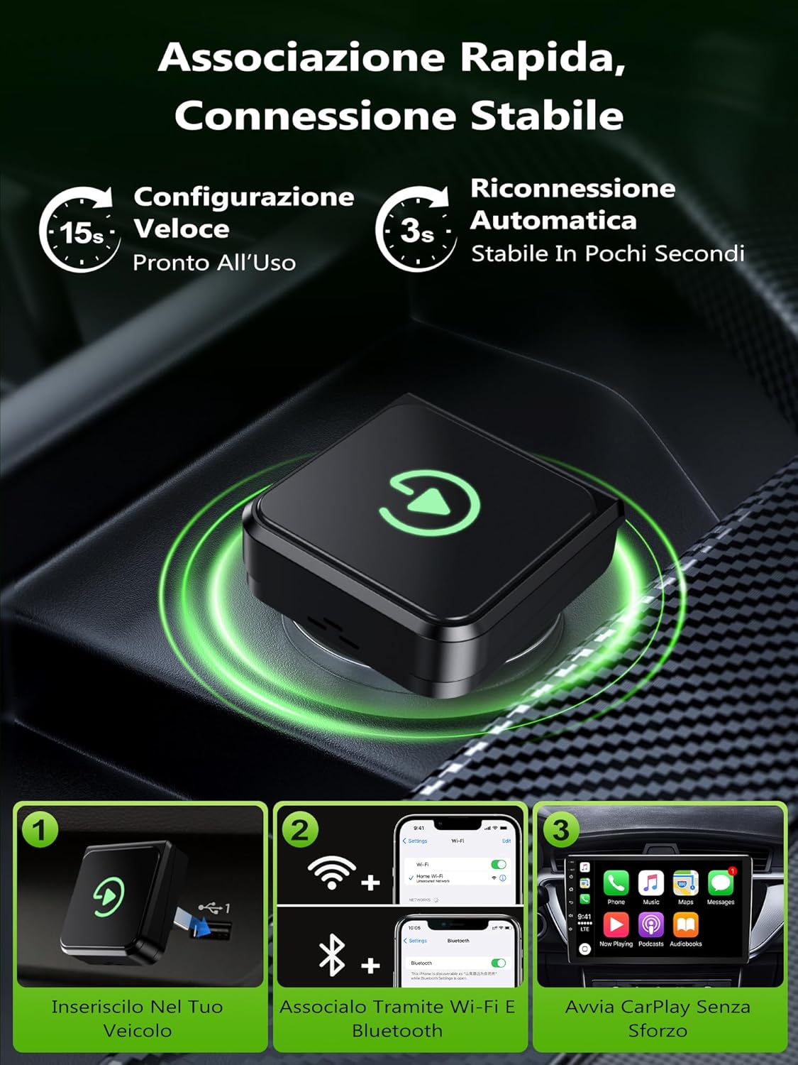 Product description:Mini Wireless CarPlay Adapter Upgrade: Upgrade your wired CarPlay system to a completely wireless experience in seconds with our wireless CarPlay adapter UK. No cables are required—simply plug in the CarPlay wireless adapter via USB-A or Type-C to enjoy seamless connectivity. The connection establishes automatically within 15 seconds. Once paired, it automatically connects each time you start your car. Perfect for daily commutes, long trips, or city driving without any setup hassle.